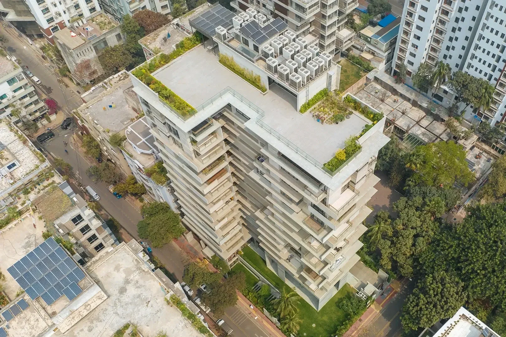 These layers allow for creating a bold architectural outlook while also utilizing climatic design pragmatics to provide ample shading to the interior spaces. The architecture of Simpletree Kafil Manor is rooted in the semantics of contemporary modern design ideologies, while simultaneously challenging the common approach to apartment design.